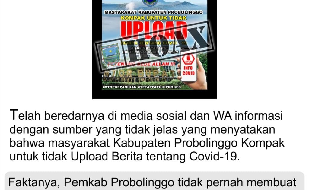 Adanya info terkait masyarakat Kabupaten Probolinggo kompak untuk tidak upload berita Covid-19, agar masyarakat hidup tenang dan tentram dengan logo Lambang Pemerintah Kabupaten Probolinggo dan foto Kantor Bupati Probolinggo, bersama ini disampaikan bahwa informasi tersebut adalah hoax dan bukan dikeluarkan oleh Pemerintah Kabupaten Probolinggo.