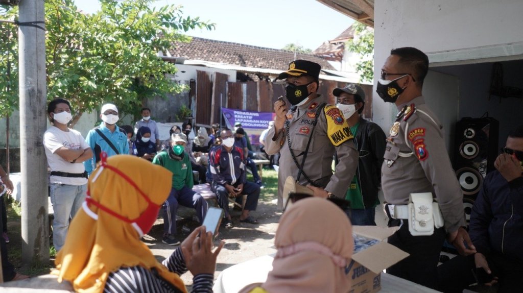 “ Kami dari Kepolisian juga menyerahkan bantuan sebanyak 100 paket sembako kepada anggota Paguyuban PKL sebagai bentuk kepedulian dari jajaran Polisi kepada masyarakat. Untuk yang belum mendapatkan bantuan sama sekali diharapkan menghubungi Bhabinkamtibmas, Babinsa maupun Lurah setempat agar segera ditindaklanjuti “, terangnya.