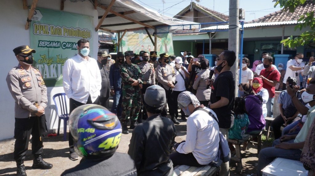 Jemput Bola, Forkopimda Kota Probolinggo mendatangi Basecamp PPKL (Paguyuban Pedagang Kreatif Lapangan) Kota Probolinggo untuk melakukan mediasi dan audensi, Rabu (28/07/21). Kapolres AKBP R.M Jauhari S.H., S.I.K., M.Si bersama Walikota Probolinggo Habib Hadi Zainal Abidin, Dandim 0820 Letkol Inf Imam Wibowo, Kajari Hartono, SH., M.H. dan Ketua PN Budi Hariyanto, SH.MH dialog bersama puluhan anggota PPKL di Jl. MT. Hariyono Gg. V Kel. Jati Kec. Mayangan Kota Probolinggo untuk mendengar dan mencari solusi terkait dengan kebijakan PPKM Level 4.